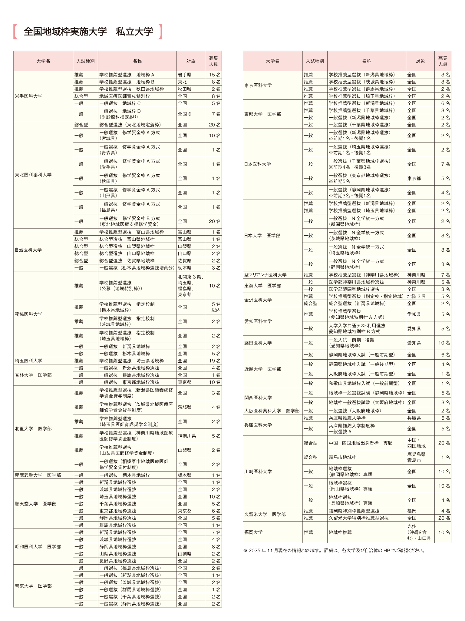 地域枠も入試や合否判定は大学が行います。都道府県が試験に関与する場合もありますが少数です。特徴的なのは別枠入試という地域枠を志願する受験生のみから選抜する入試で、一般選抜合格者を後で地域枠に振り替えたり、埋まらなかった地域枠定員を一般選抜定員として利用したり出来ない点です。一般選抜や他都道府県地域枠と併願できる大学もありますが、受験生全員が地域枠を志願している点は共通です。そのため多くの大学が「合格した場合に入学を確約できる者」を要件としており基本的に補欠合格はありません。合格後辞退は地域医療を支える医師の減少に直結するためよく考えた上での出願が必要です。