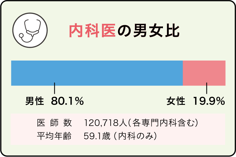 体の内部から治療するのが名前の由来とされています。全身を対象に、問診、視診、触診、検査などを通して診断します。一般的には手術を行わず、薬の投与や生活指導などによって対処します。内科がカバーする範囲は広く、呼吸器内科、循環器内科、消化器内科など臓器や疾患によって専門が分かれています。原因が分からない体調不良時にはまず内科を受診するケースが多く、人々の生活に密着した診療科ともいえます。さまざまな症状や疾患に対応するため、幅広い知識が求められ、患者が訴える症状から適切な診断を下す判断力や、話にしっかり耳を傾け、信頼関係を築くコミュニケーション力も必要です。開業医を含め、医師数、病院数とも最も多いです。