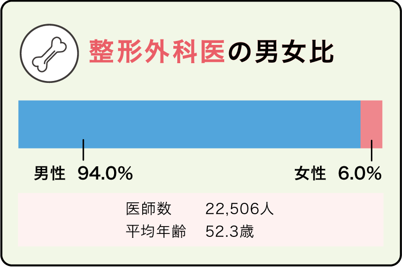 骨や関節などの運動器や脊椎・脊髄に関する変形疾患や骨折、外傷性疾患を診断・治療します。スポーツ障害に対応することもあります。脊髄、骨盤、肩、肘、膝、手足の指など対象は幅広く、患者も全ての年齢層にわたるので患者数、医師数ともに多いです。